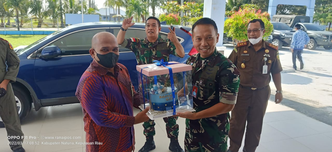Hal ini terlihat saat Ketua Komisi I DPRD Kabupaten Natuna, Wan Arismunandar memberikan kue ulang tahun ke 47 kepada Danlanud RSA, Kolonel Pnb Jajang Setiawan di Markas Komando Lanud RSA Natuna, Kamis 17 Maret 2022.