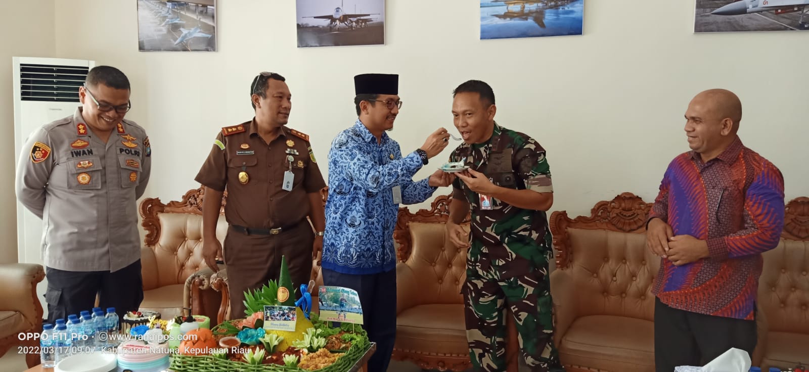 Pemberian ucapan selamat Ultah ke 47 Kolonel Pnb Jajang tersebut ditandai dengan penyerahan Kue Ulang Tahun Kepada Kolonel Pnb Jajang yang mana ditandai dengan penyerahan Kue Ucapan Ultah dari Bupati Natuna Wan Siswandi yang disampaikan oleh Sekda Natuna Boy Wijanarko Varianto serta dilanjutkan penyerahan Kue dan pemberian ucapan selamat para rombongan serta di lanjutkan dengan sesi poto bersama.