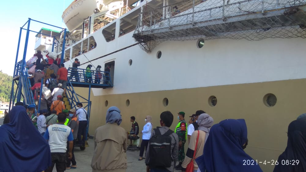 Di pelabuhan terlihat sejumlah petugas dari Polsek, Babinsa dan petugas pelabuhan berjaga mengatur penumpang naik turun dari kapal. Di lokasi tidak terlihat petugas kesehatan melakukan uji validasi terhadap penumpang.