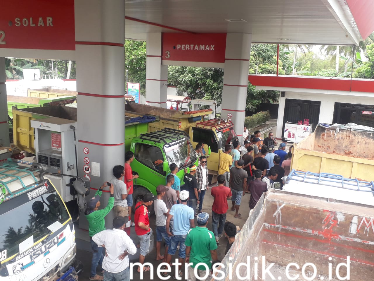 Dari pantauan metrosidik di lokasi, puluhan mobil dump truk berjejer di samping jalan antre dan di halaman dalam SPBU.