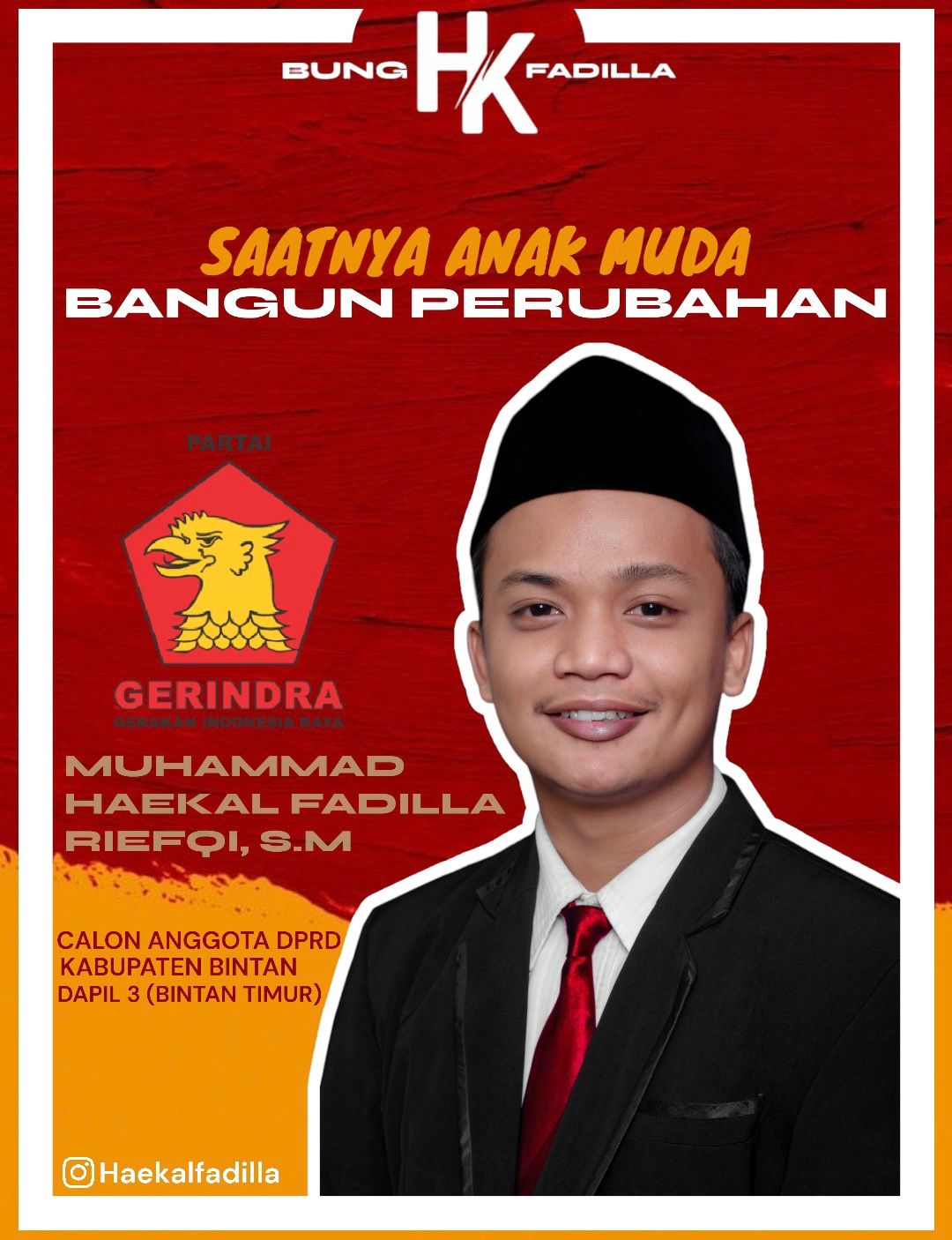 Selalu menggunakan peci setiap berpose, pemuda kelahiran Kabupaten Bintan ini memberanikan diri untuk terjun ke kancah politik. Mengawali karirnya di organisasi dan sering tampil sebagai narasumber seminar kewirausahaan. Haekal Fadilla, S.M bukan tanpa sebab, ia ingin memperjuangkan masyarakat Kabupaten Bintan terkhusus kaum marginal. Yang dimaksudkan oleh pemuda kelahiran Bintan ini, yakni pelayanan kesehatan dan pendidikan yang belum sepenuhnya dapat diakses oleh masyarakat miskin.