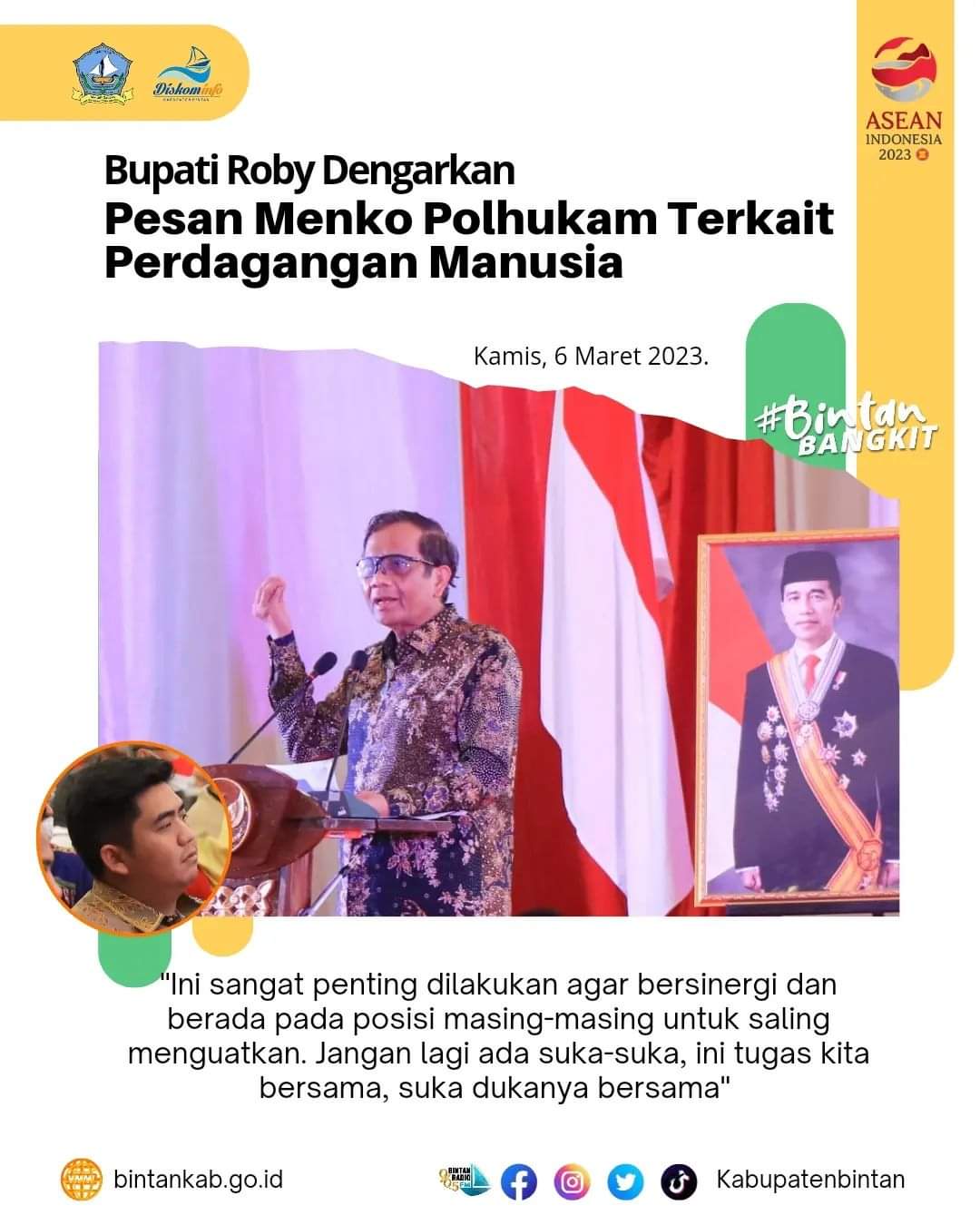 Bintan, Metrosidik.co.id – Bupati Bintan Roby Kurniawan menghadiri undangan Diskusi Publik dengan tema Perang Semesta Melawan Sindikat Penempatan Ilegal Pekerja Migran Indonesia oleh Badan Perlindungan Pekerja Migran Indonesia, Kamis (06/04) di Hotel Swissbell Harbour Bay Kota Batam. Menteri Koordinator Politik, Hukum dan Keamanan Mahfud MD langsung memberikan paparan terkait hal penting tersebut.
