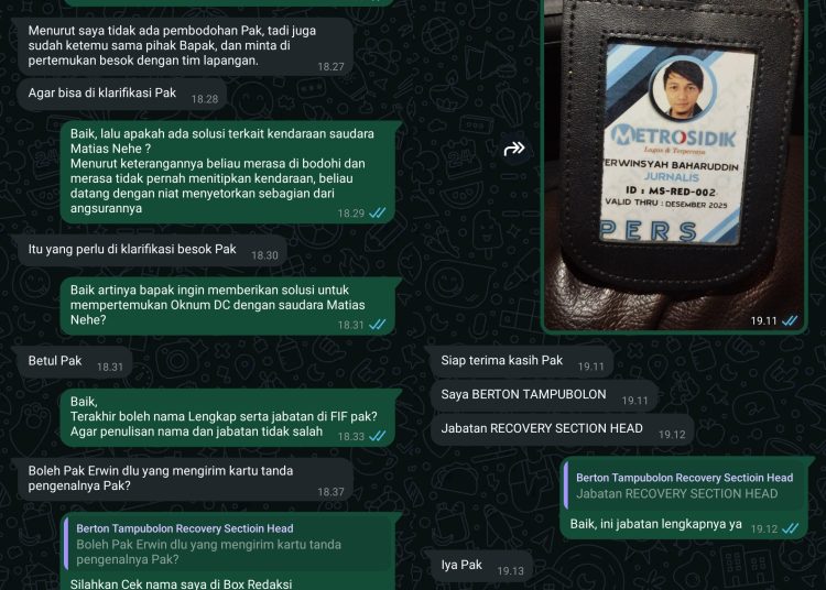 Salah satu upaya konfirmasi dilakukan kepada Berton Tampubolon, selaku Recovery Section Head FIFGROUP Batam, pada Selasa (15/5) melalui aplikasi WhatsApp. Berton bahkan sempat meminta Kartu Tanda Anggota (KTA) Pers dari wartawan Metrosidik.co.id sebelum akhirnya memberikan nama lengkap dan jabatannya. Namun hingga tenggat waktu penerbitan, redaksi belum menerima jawaban atau klarifikasi resmi dari yang bersangkutan maupun dari pihak FIFGROUP Cabang Batam.