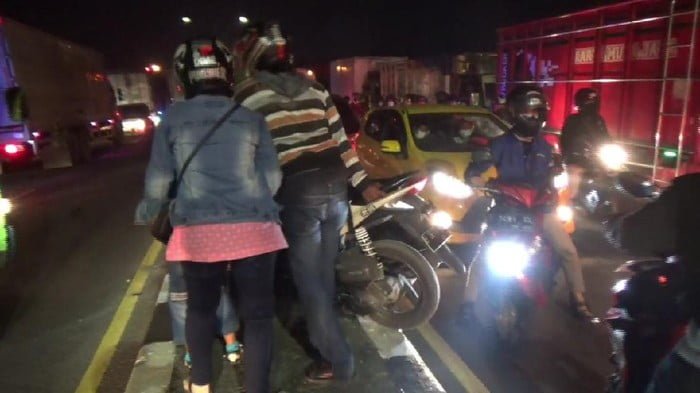 Kemacetan didominasi kendaraan pemudik sepeda motor yang bertahan menolak diputar balik, mereka menduduki jalur dan mematikan mesinnya menunggu petugas membuka penyekatan.