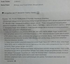 Surat Sanggahan PT. Musafir Tour & Travel Kepada ULP Anambas, Metrosidik.co.id–Unit Kerja Pengadaan Barang dan Jasa …